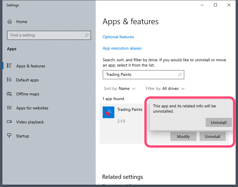 Under Apps & features, search for Trading Paints. Select Trading Paints from the list and choose Uninstall. Follow the prompts on your screen to uninstall the program from your computer.