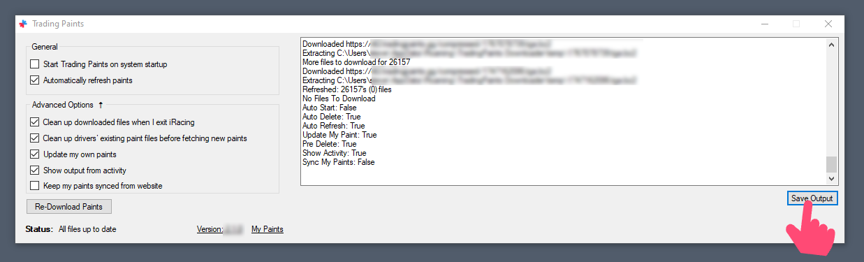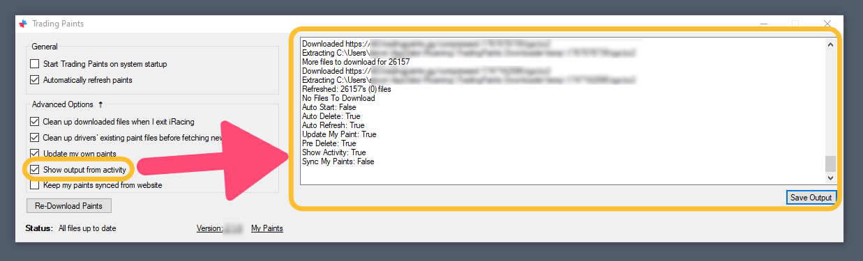 The activity output log contains a detailed list of settings and actions taken by Trading Paints Downloader, which provides helpful information for diagnosing problems.