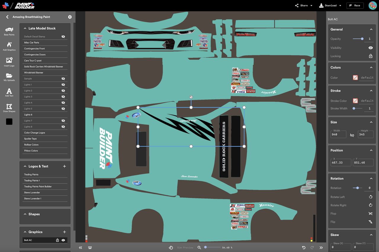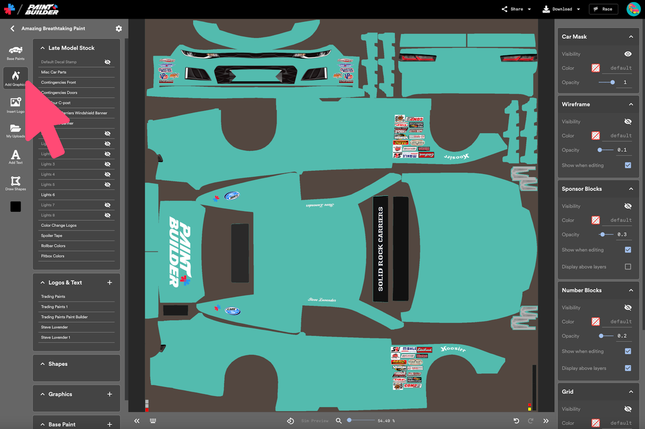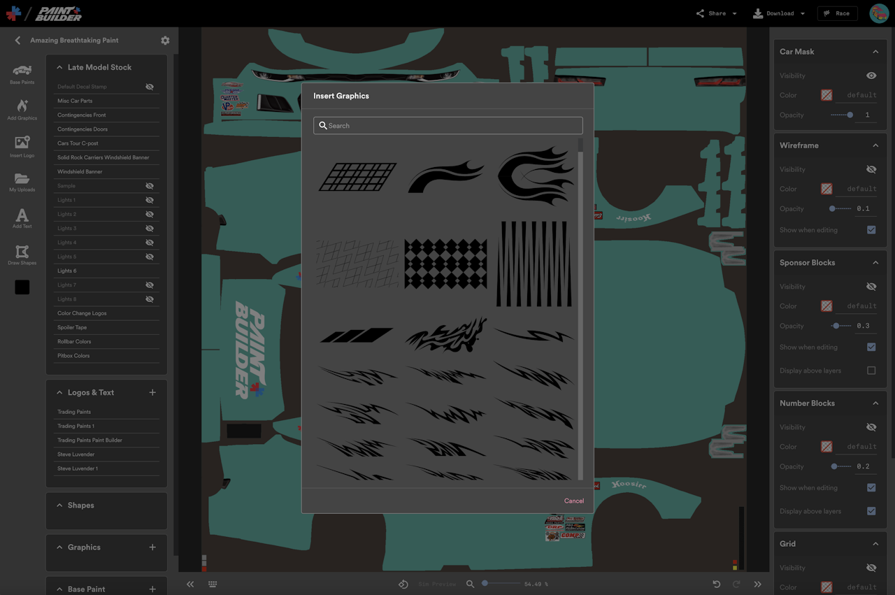 Paint Builder comes with hundreds of original, exclusive customizable shapes and designs called Graphics. Graphics range from flames to splashes to graffiti to angles, and far beyond.