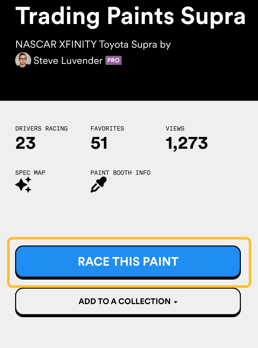 To assign an iRacing paint that was submitted to the Showroom, navigate to the paint you’d like to use and click the “Race this paint” button. You must be logged in to Trading Paints to do this.