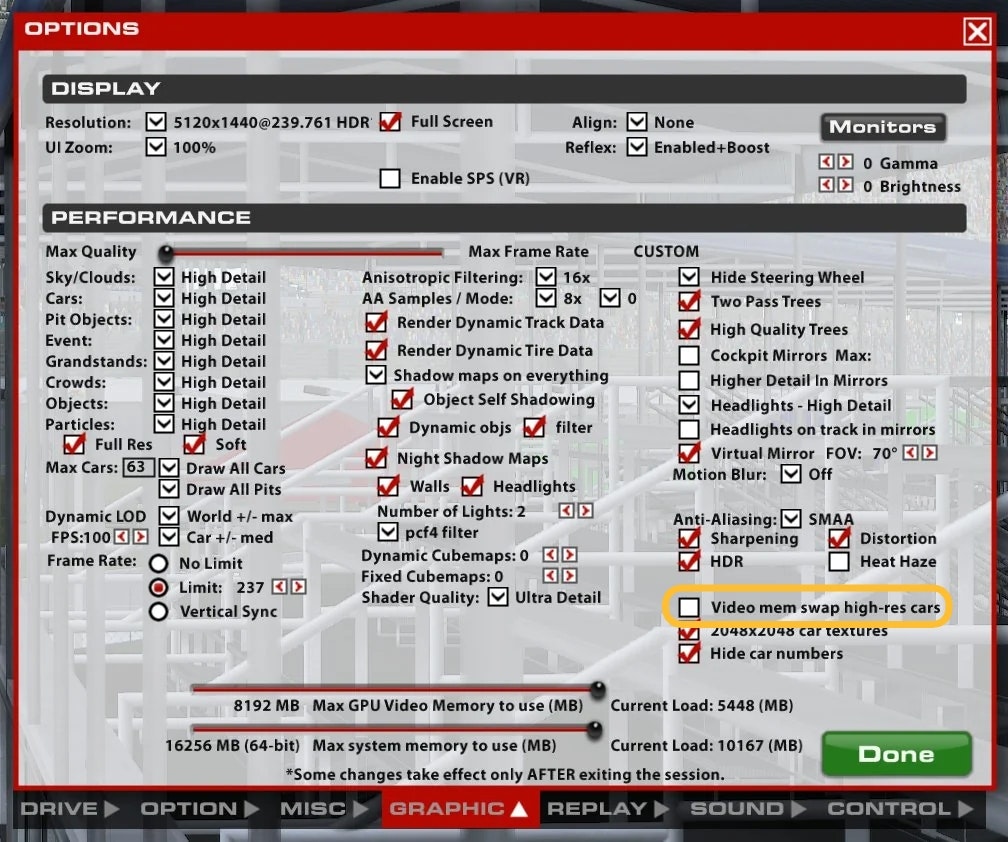 Launch a session in the iRacing sim (test, practice, race, or otherwise).Open theOptionsmenu.Choose theGraphicstab.You may need to click theAdvancedbutton if you don’t see lots of individual performance settings.Uncheck the option labeledVideo mem swap high-res cars.ClickDoneto close the options menu.Fullyclose out of the iRacing simand restart the sim in order for the changes to take effect.