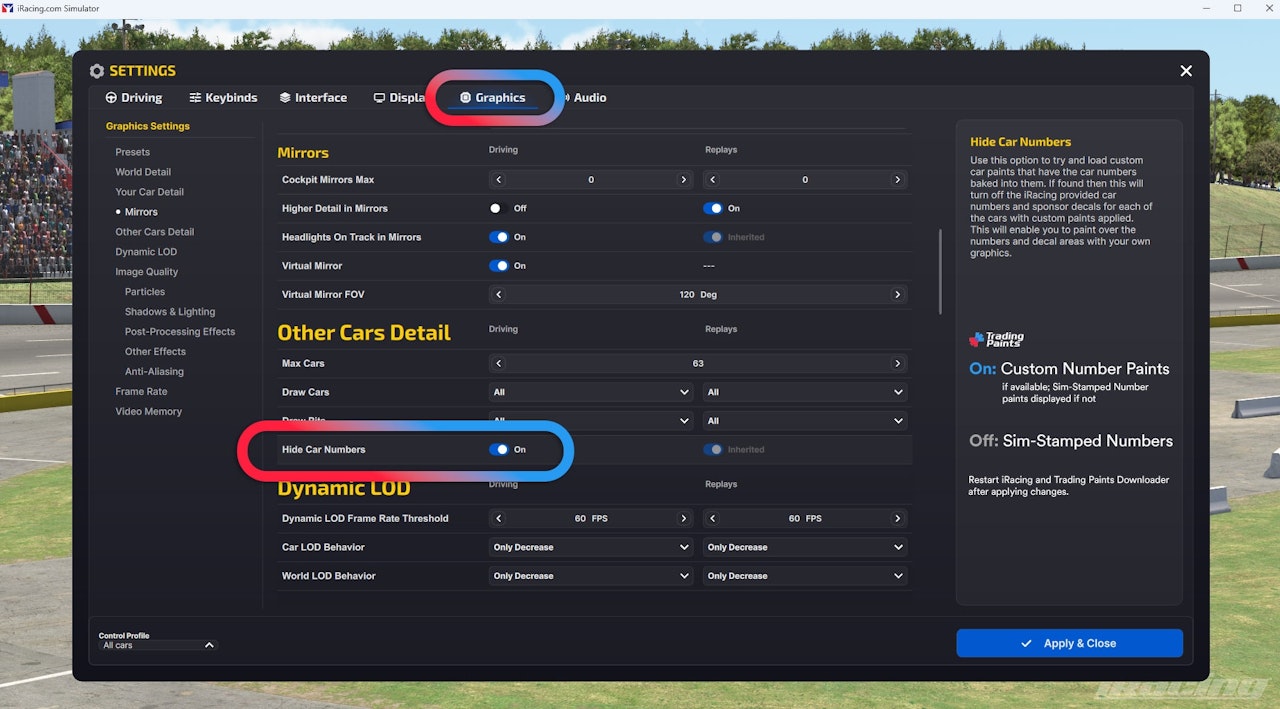 With the iRacing simulator open, choose Settings, navigate to the Graphics tab at the top, and under Other Cars Detail, change Hide Car Numbers to the On position. Apply the changes to enable Custom Number paints to appear next time you race.