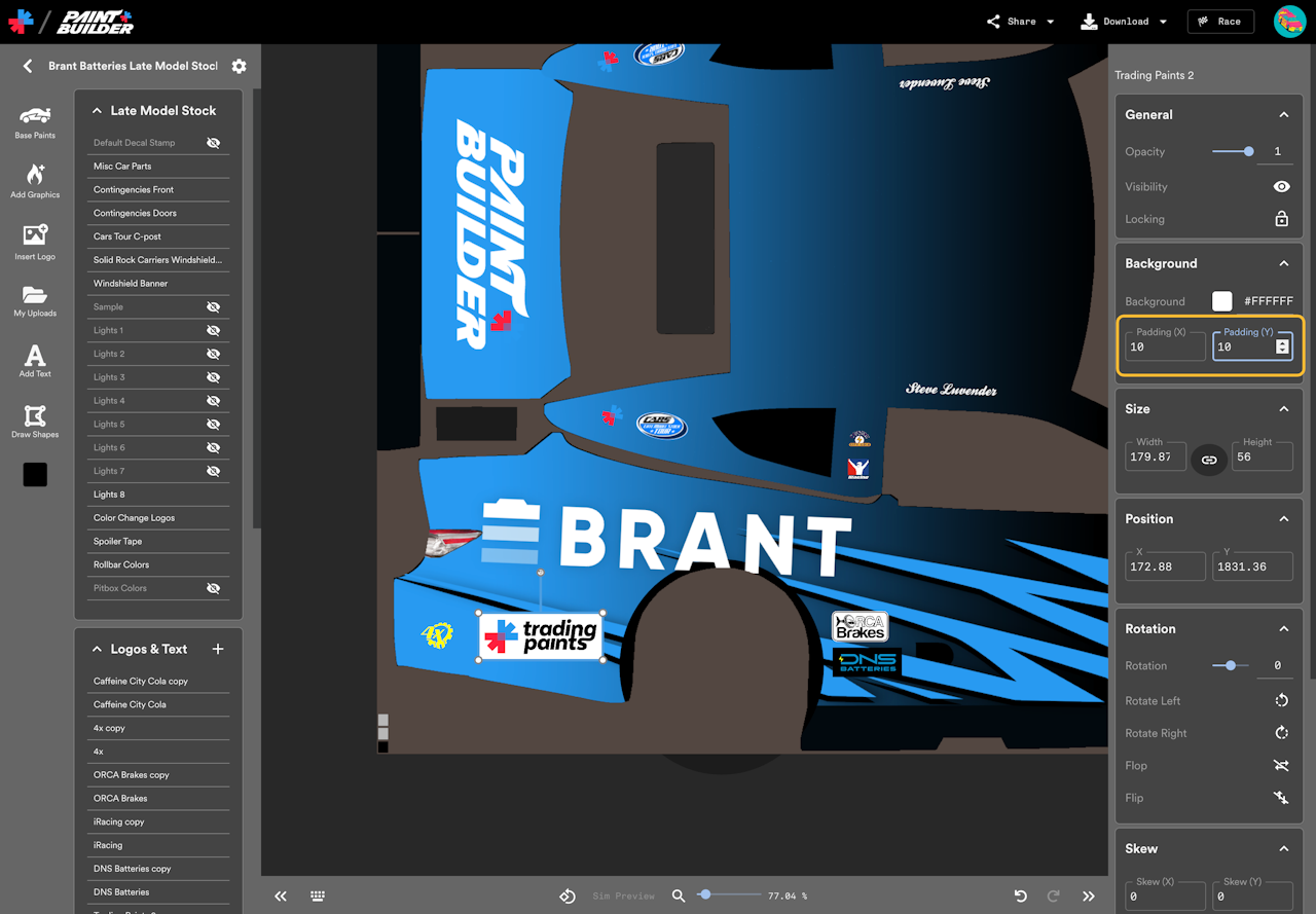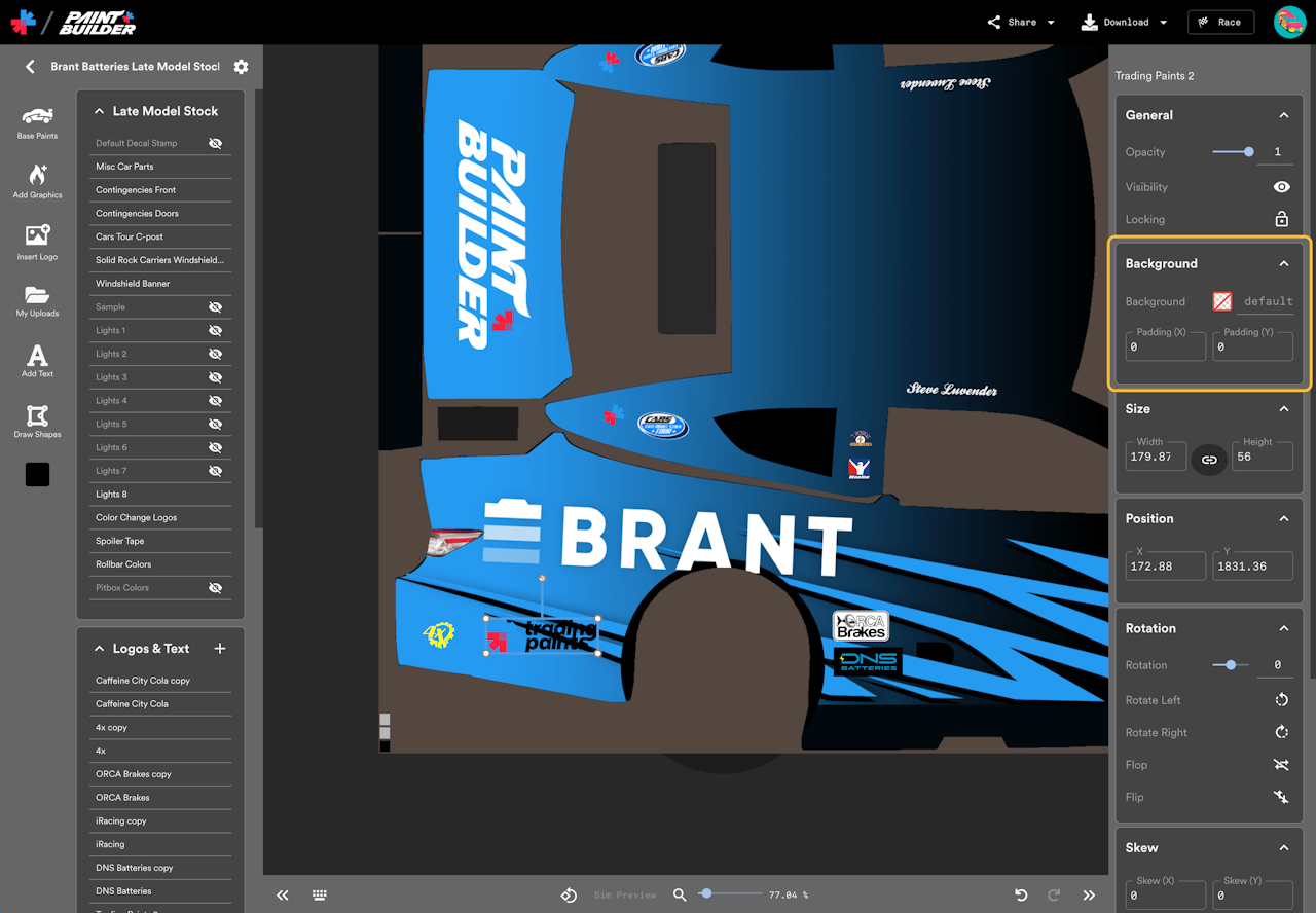 On a race car livery, sometimes a logo can be difficult to see if it’s placed over a complicated area of the car design. To overcome this, designers sometimes put the logo over a solid-color block. You can achieve a similar “sticker”-like effect in Trading Paints Paint Builder.