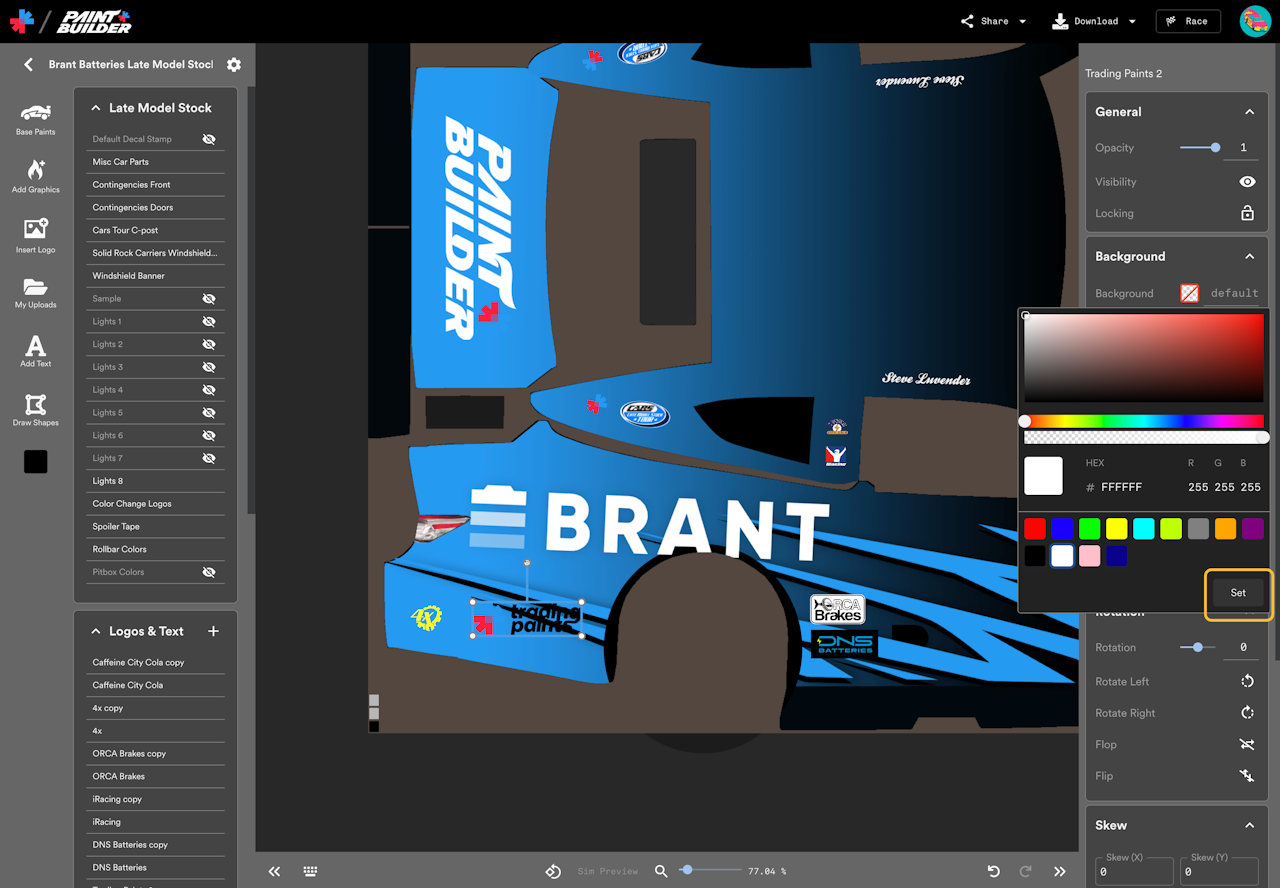 On a race car livery, sometimes a logo can be difficult to see if it’s placed over a complicated area of the car design. To overcome this, designers sometimes put the logo over a solid-color block. You can achieve a similar “sticker”-like effect in Trading Paints Paint Builder.