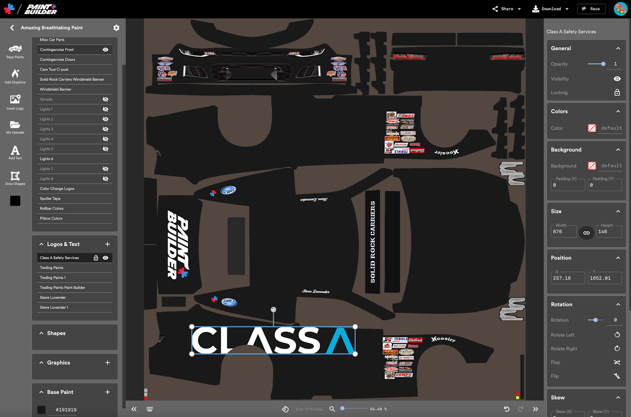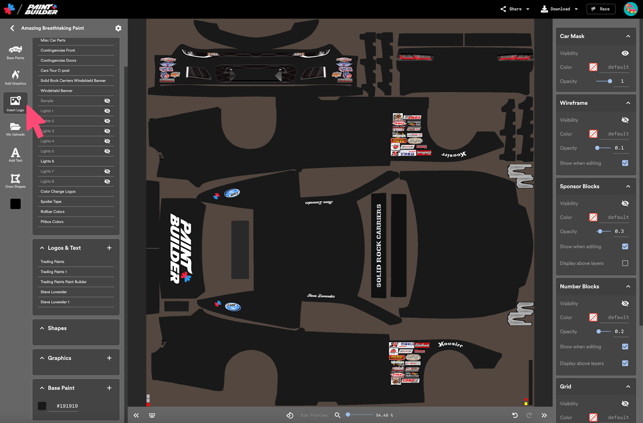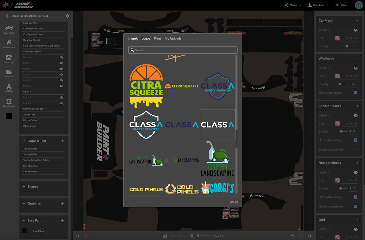 Paint Builder contains hundreds of premade logos that you can insert into your projects. These logos include Trading Paints brands logos, partner logos, and logos for fictional, nonexistent brands that were created just for Paint Builder. (Some longtime sim racers may even recognize a few familiar throwbacks!)