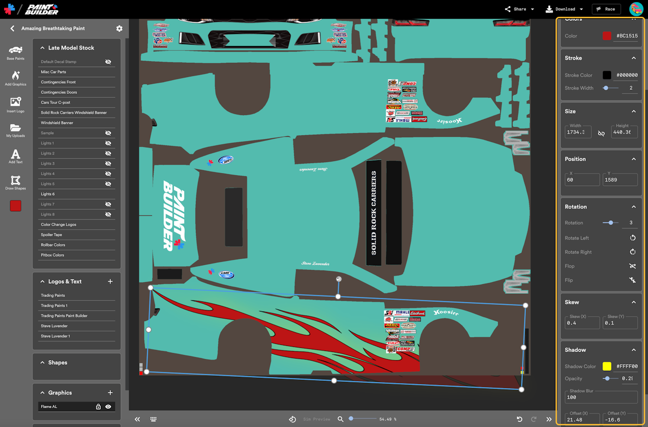 Paint Builder comes with hundreds of original, exclusive customizable shapes and designs called Graphics. Graphics range from flames to splashes to graffiti to angles, and far beyond.