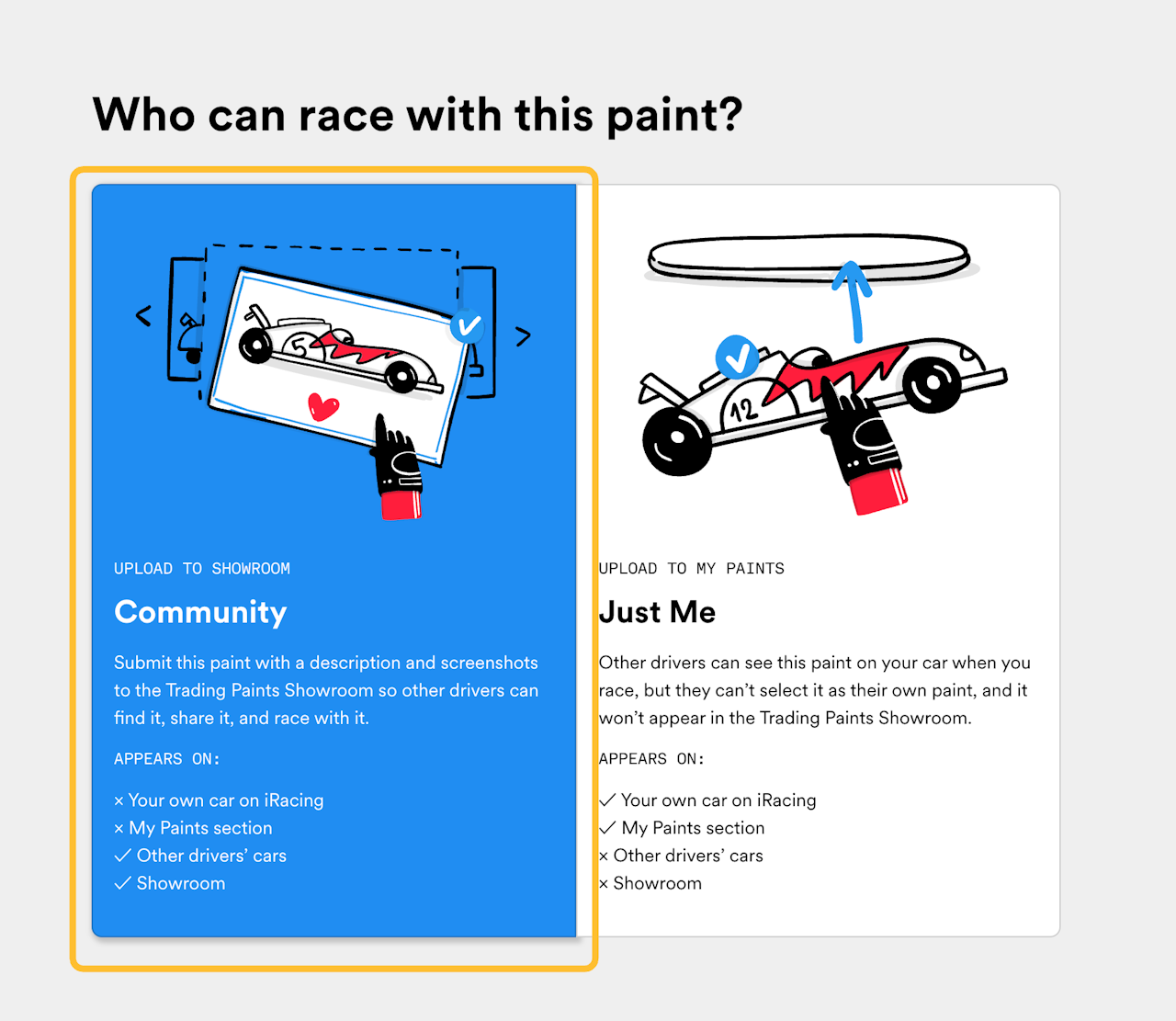 For the “Who can race with this paint?” option, keep the selection on the “Community” option because you want to share your work in the Showroom.