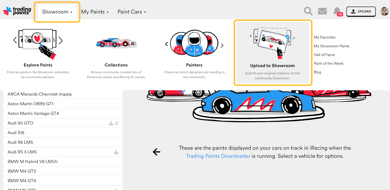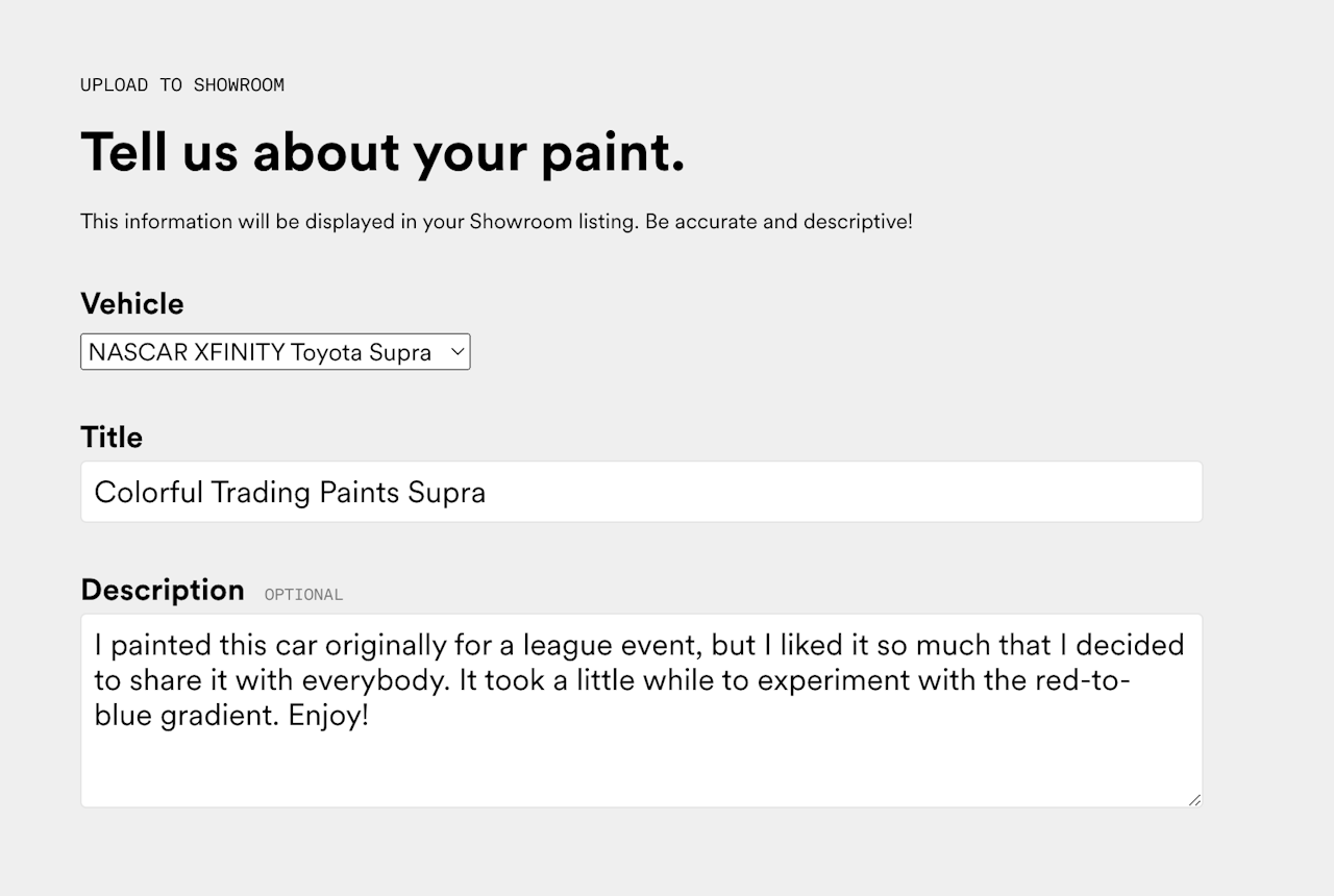 If you’ve created an original paint, you can upload it to the Showroom to share it with the community.