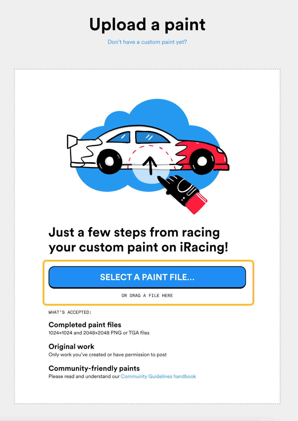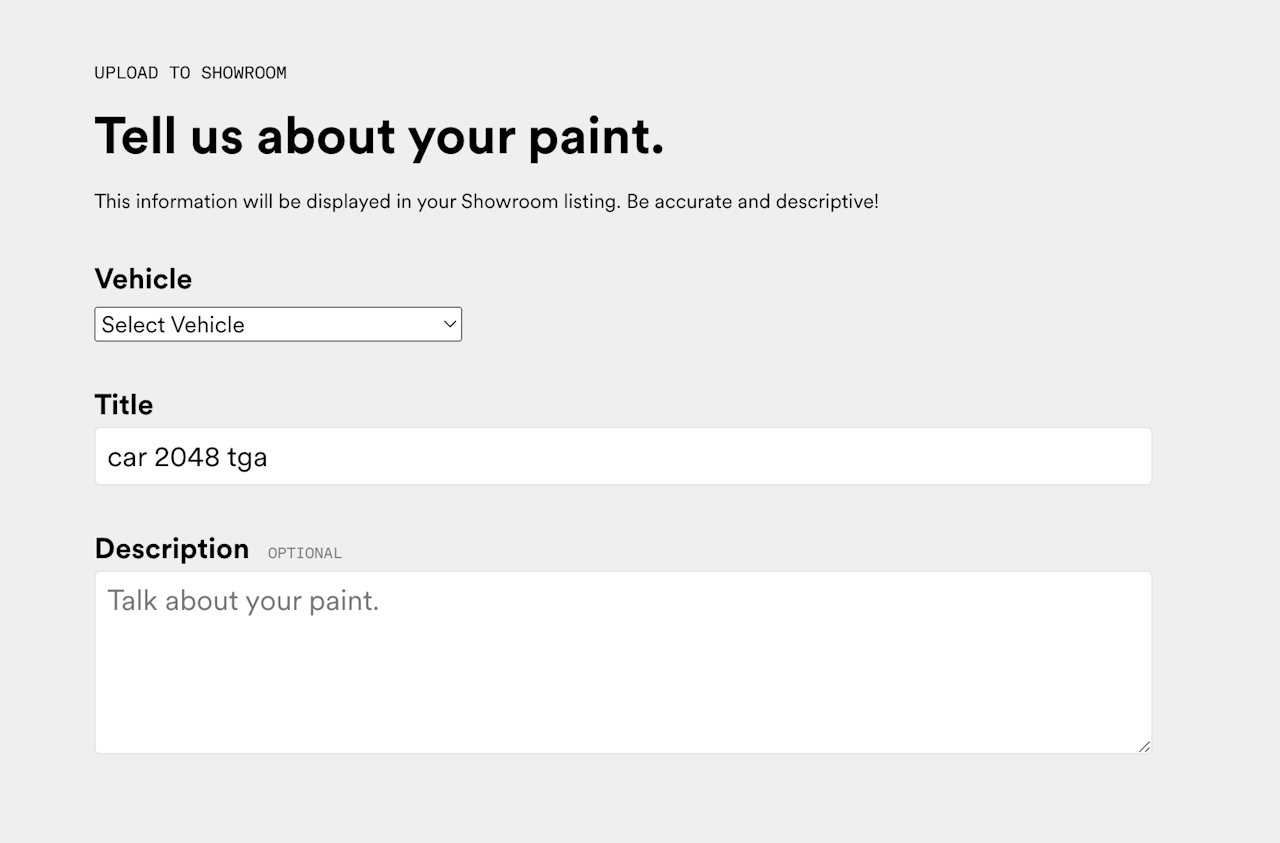 On the Showroom Upload screen, you’ll first be prompted to select the completed paint file from your computer.