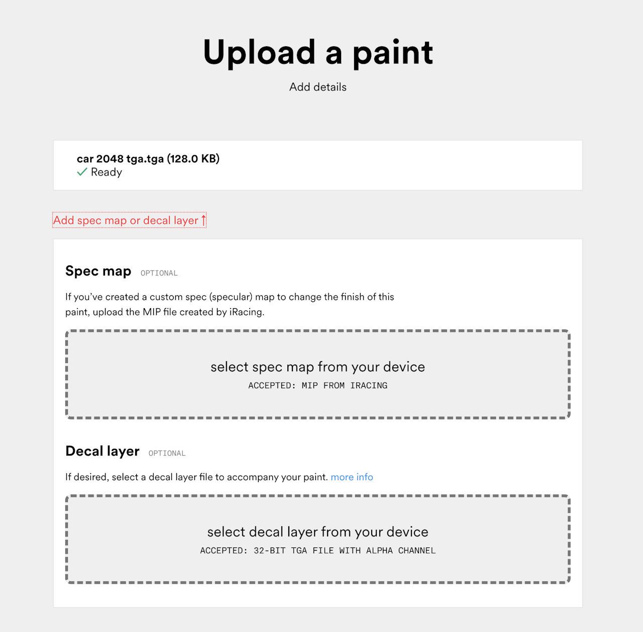 If you’ve created a spec map (MIP file) or decal layer file (a secondary TGA file, which is quite rare) to accompany your paint, you can click “Add spec map or decal layer” at the top of the screen and add those files if needed.