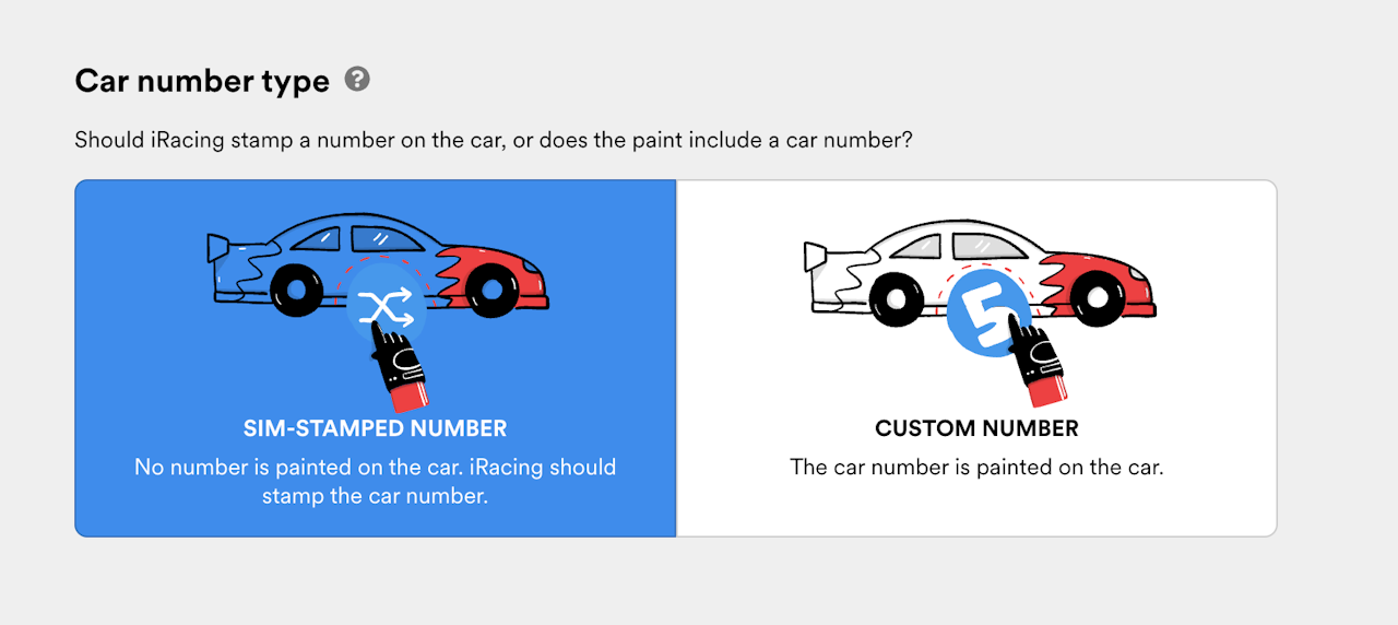 If you didn’t paint a number on the car and you want iRacing to stamp the number automatically (so it differs depending on your iRacing Paint Booth settings and the car number iRacing assigns you in a race), choose Sim-Stamped Number, which is the default choice.
