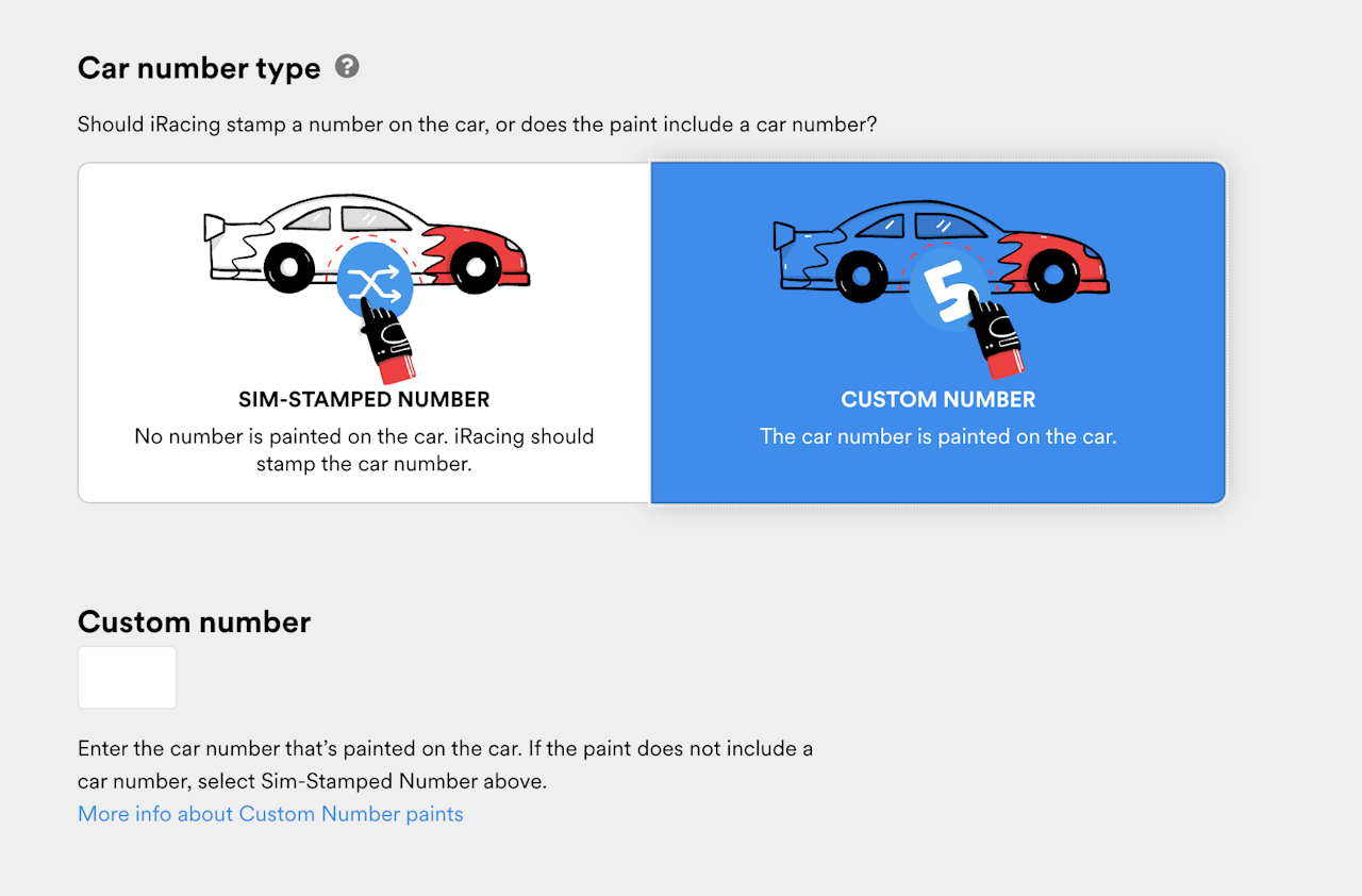 If the car number is painted directly onto the car, choose the Custom Number option and enter the number of the car. iRacing won’t stamp a number on the car if it’s a Custom Number paint.