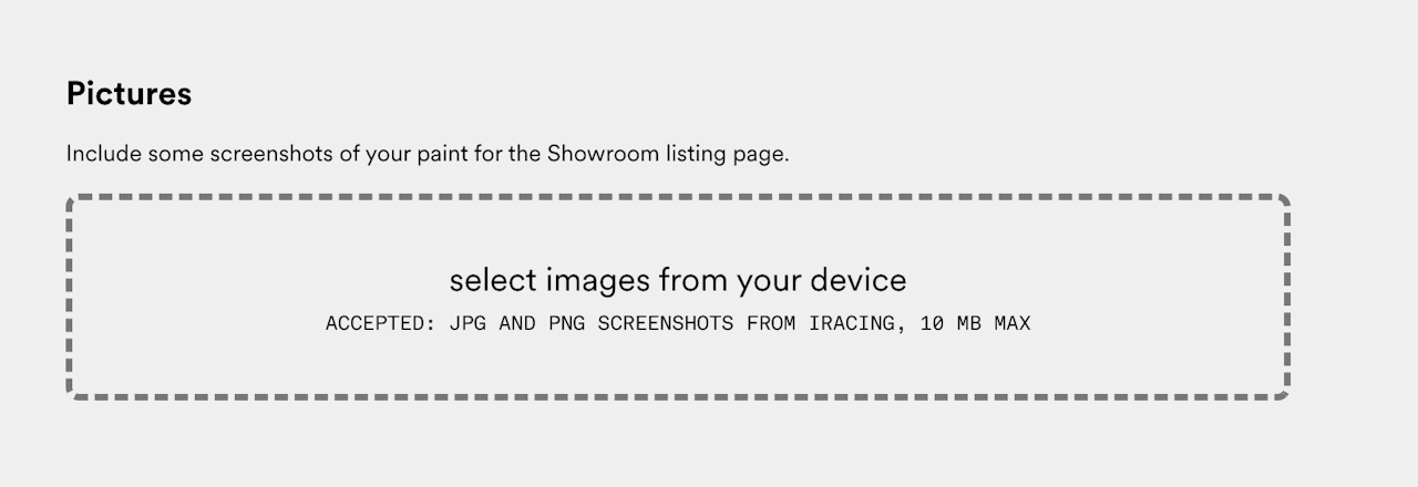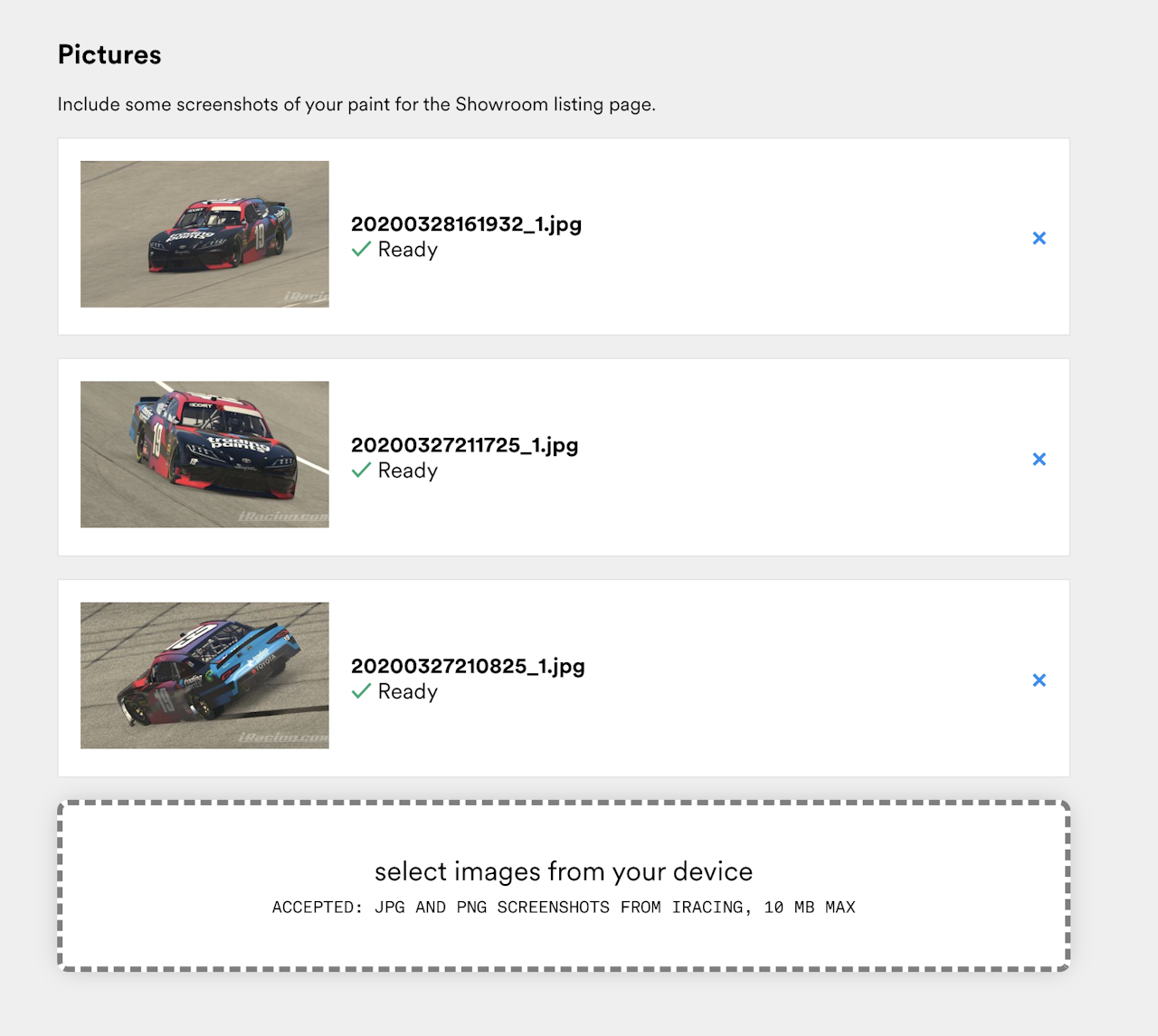Select iRacing screenshot files from your computer to accompany your listing. You can choose up to 10 image files in JPG or PNG format with a maximum 10 MB file size.