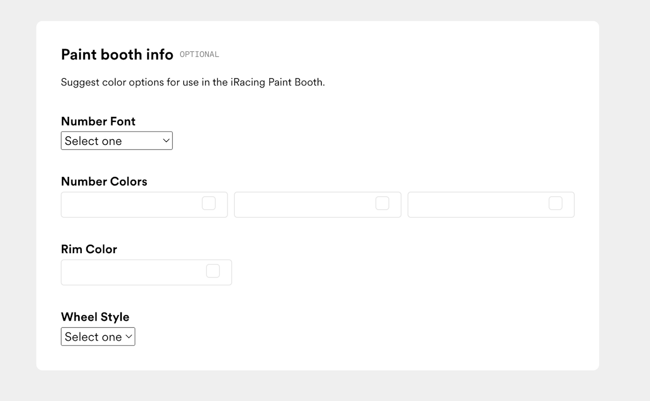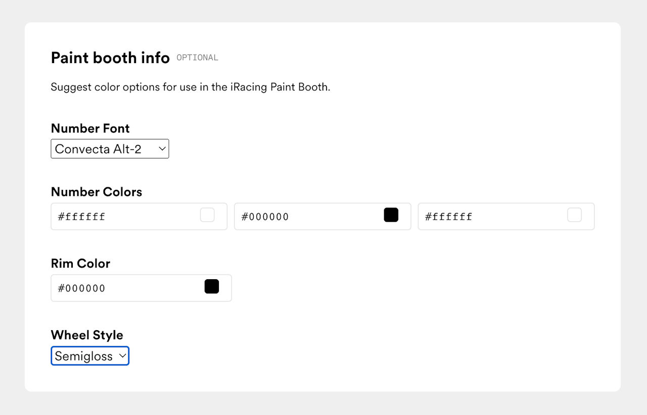 If you have specific number fonts, hex color codes, or wheel/rim styles for your paint that you’d like to note for other drivers racing your paint, you can define them in the paint booth info section. This is entirely optional.