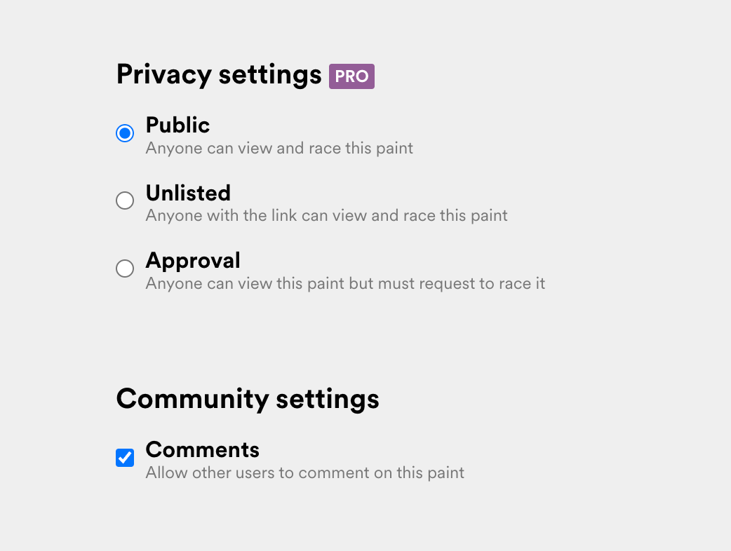 - Unlisted: anyone who has the link can view and race with your paint. Unlisted submissions are not visible on your profile page or in search results.