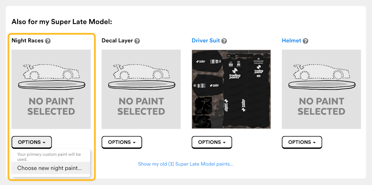To use a special paint scheme for races at night, select a vehicle from your My Paints screen, scroll to the “Also for my…” section, then select the applicable options for Night paints.